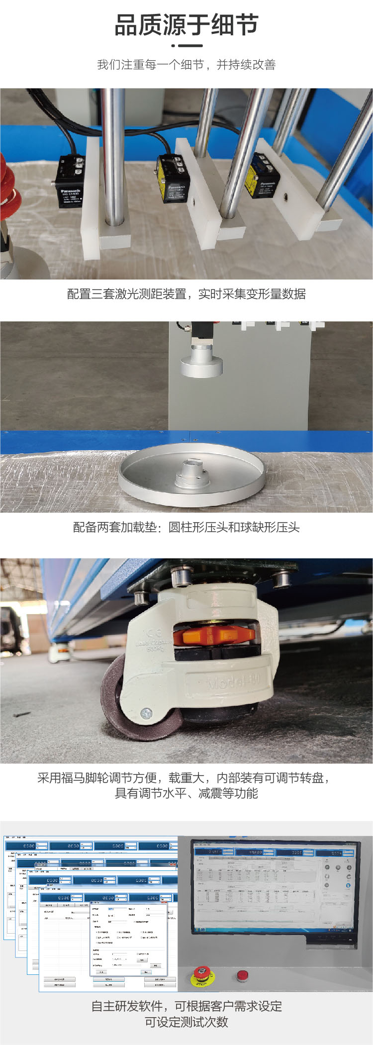 試驗標準: 1、T-SZFA 2003.1-2019《床墊人體工程學評價床墊硬度分級與分布測試評價方法》 l6.1方法A——床墊硬度等級的測定 l6.2方法B——床墊各層硬度的測定 2、T-SZFA 2003.2-2019《床墊人體工程學評價床墊貼合度定量與評價方法》 3、QBT 1952.2-2011軟體家具彈簧軟床墊 4、QBT 4839-2015軟體家具發(fā)泡型床墊 原理 通過一垂直施力裝置,對式樣的測試點進行測試,測試時通過一定形狀的加載盤以設(shè)定的速度對試樣測試點進行加載至一定的力值后經(jīng)由數(shù)據(jù)采集裝置對測試數(shù)據(jù)進行采集,由核心系統(tǒng)進行分析,對試樣進行多種標準多方法的測試。 ※ 詳細資料參數(shù)及設(shè)備報價請聯(lián)系我司. | ||
