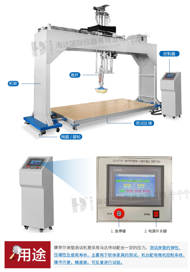 1) 試件:適用床墊尺度:0~2200x2000x400(L x W x H) 2) 控制方式:7寸觸摸屏+匯川PLC 3) 電氣連接:單相 AC220V/50HZ功率:750W/400W 4) 標(biāo)準(zhǔn)配件:壓陷量測試頭一個(gè)、量具一把 5) 尺寸:整體3650x1000x2700(L x W x H) 控制器 350x350x1100 (L x W x H) 6) 重量:500KG | ||