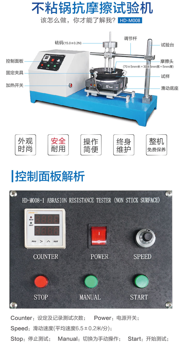 1、 摩擦頭:“Scotchbrite” No. 7447 or 447 (5x 70 x30mm) 2、 水平往復(fù)行程:100 mm ±5 mm 3、 速度:6.5 ±0.2m /min 4、 施加在摩擦塊上的總壓力:15±0.2N 5、 沒50周次更換一次摩檫頭共試驗(yàn)250周次 | ||