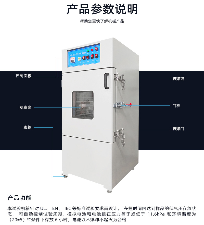本試驗機箱針對UL、EN、IEC等標準試驗要求而設計,在短時間內達到樣品的低氣壓存放狀態(tài),可自動控制試驗周期,全程監(jiān)控箱內氣壓變化,實現(xiàn)試驗的自動終止。模擬電池和電池組在壓力等于或低于11.6kPa和環(huán)境溫度為(20±5)℃條件下存放6小時,如果電池無滲漏,無排氣,無解體,無破裂和無起火,并且每個實驗電池或電池組在試驗后的開路電壓不小于其在進行模擬實驗前的電壓的90%,即為合格。 滿足標準:GB/T 31485-2015,GB/T 31241-2014,UN38.3,IEC62133,QC/T743-201X,GB/T 8897.4-2008,GB/T 21966-2008 | ||