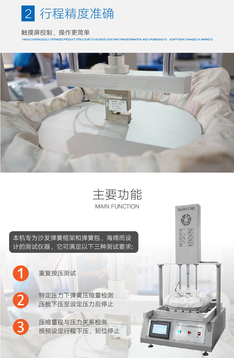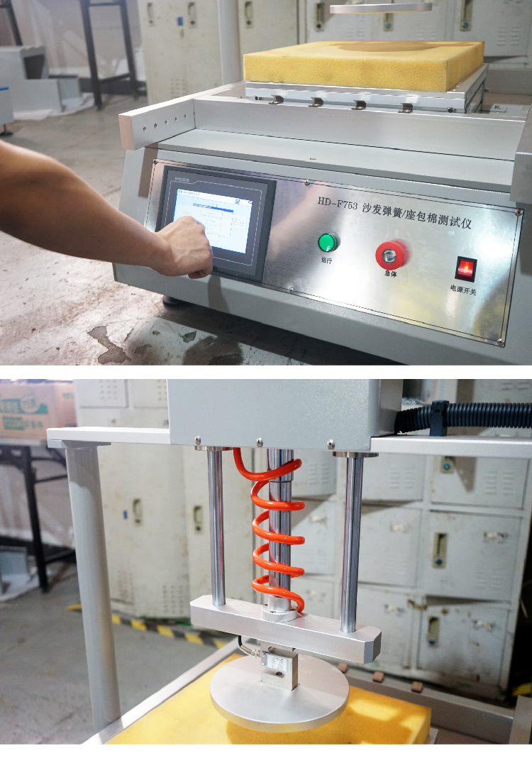 沙發(fā)彈簧測試儀用于測試沙發(fā)及家具坐墊的彈簧框架及彈簧包和彈簧坐墊的耐久性和承受力??砂搭A(yù)設(shè)定之壓力條件進(jìn)行重復(fù)按壓測試,周期可預(yù)設(shè)定,到數(shù)自動停止。 | ||