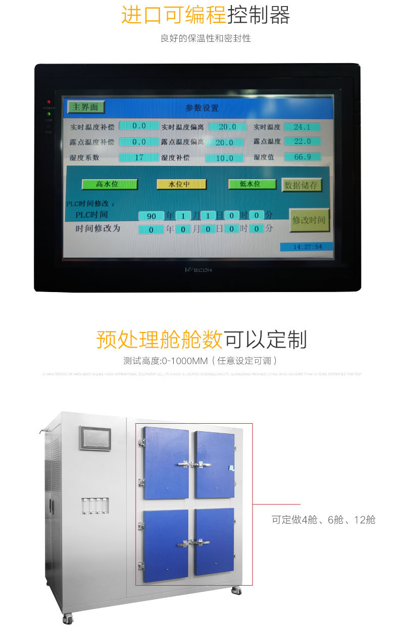 箱內(nèi)容積:內(nèi)含多個(gè)處理艙,單個(gè)處理艙尺寸(W×D×H)400×600×600mm 溫度范圍:(20~40)℃,精度:±0.5℃,分辨率:0.1℃,連續(xù)可調(diào) 濕度范圍:(40~60)%RH,濕度偏差±3%RH,分辨率:0.1%RH,連續(xù)可調(diào) 箱內(nèi)空氣置換率:(0.5~1.5)m3/h,連續(xù)可調(diào),精度±0.05 m3/h 箱內(nèi)空氣流速:(0.1~0.3)m/s,連續(xù)可調(diào),精度±0.05 m/s 甲醛笨底濃度:≤0.01mg/m3 工作時(shí)間:連續(xù)工作時(shí)間不小于30天 控制系統(tǒng):采用觸摸控制屏作為人員操作設(shè)備的對(duì)話界面,德國(guó)西門子PLC控制系統(tǒng) 控濕方式:采用露點(diǎn)加濕系統(tǒng),濕度和溫度的自動(dòng)調(diào)節(jié)、連續(xù)恒定 制冷系統(tǒng):采用原裝進(jìn)口意大利阿斯帕制冷壓縮機(jī) 保護(hù)系統(tǒng):制冷系統(tǒng)高壓、過(guò)流保護(hù),加熱器超溫保護(hù),電機(jī)過(guò)流保護(hù),缺水保護(hù),空氣泵過(guò)熱、過(guò)流、超壓保護(hù)等。 | ||
