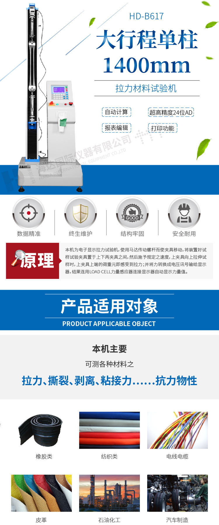 線材端子拉力試驗機HD-B617測試各種材料、半成品及成品的抗拉強度、抗壓強度及伸長量,可做剝離、撕裂、抗彎、抗折、壓縮等試驗,適合金屬、塑料、橡膠、紡織品、合成化學(xué)制品、電線電纜、皮革等行業(yè)使用 設(shè)計標準:GB/T 16491、GB/T 1040、GB/T 8808、GB/T 13022、GB/T 2790、GB/T 2791、GB/T 2792、GB/T 16825、GB/T 17200、GB/T 3923.1、GB/T 528、GB/T 2611、GB/T 6344、GB/T 20310、GB/T 3690、GB/T 4944、GB/T 3686、GB/T 529、GB/T 6344、GB/T 10654、HG/T 2580、JC/T 777、QB/T 2171、HG/T 2538、CNS 11888、JIS K6854、PSTC-7、ISO 37、AS 1180.2、BS EN 1979、BS EN ISO 1421、BS EN ISO 1798、BS EN ISO 9163、DIN EN ISO 1798、GOST 18299、DIN 53357、ISO 2285、ISO 34-1、ISO 34-2、BS 903、BS 5131、DIN EN 12803、DIN EN 12995、DIN53507-A、DIN53339、ASTM D3574、ASTM D6644、ASTM D5035、ASTM D2061、ASTM D1445、ASTM D2290、ASTM D412、ASTM D3759/D3759M | ||