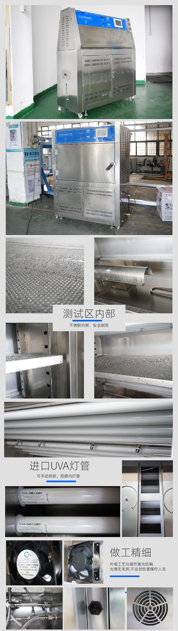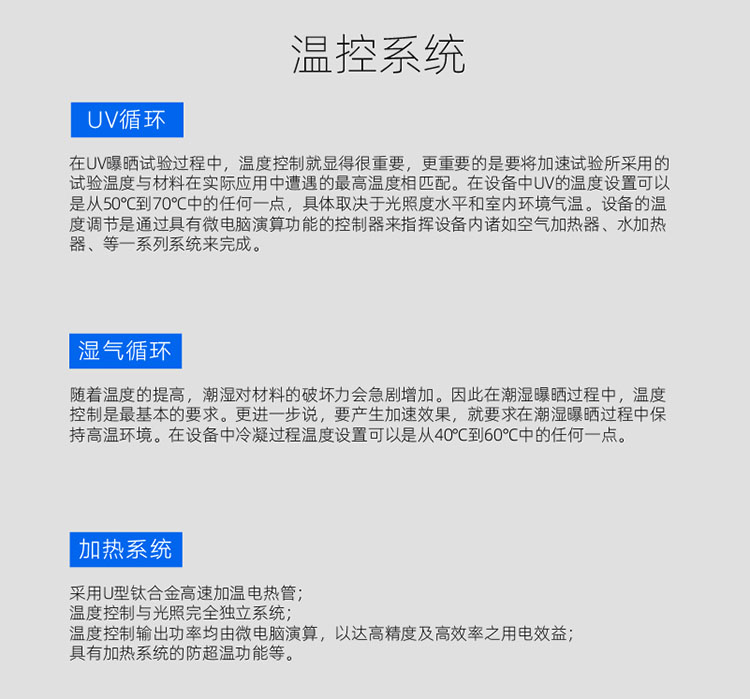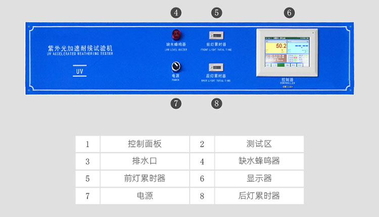 1. 光源采用8支UV系列額定功率為40W的紫外熒光燈管作發(fā)光源,分布 在機器的兩側(cè),每側(cè)各4支。 2. 試樣表面與紫外燈平面距離為50毫米且相平行。 3. 有UV-B313.UV-A340.光源供用戶選擇配置(任選一種)。 4. UV-A340燈管的發(fā)光光譜能量主要集中在340nm波長附近。 5. UV-B313燈管的發(fā)光光譜能量主要集中在313nm波長附近。 6.燈管:專用紫外燈管,二排共8只,40W/只。 7. 由于熒光燈光能量輸出會隨時間而逐步衰減,為了減小因光能量衰減造成試 驗的影響,所有的8支燈管中每隔1/4的熒光燈壽命時,由一支新燈管替換一支舊燈管,這樣,紫外光源由新燈和舊燈組成,從而得到一個輸出恒定的光能量。 結(jié)構(gòu)特點 1.箱體采用數(shù)控設(shè)備制作、工藝先進(jìn)、線條流暢,美觀大方。 2.箱體材質(zhì)為1.0mm厚304SUS不銹鋼板及鋁合金框架。 3.加熱方式為內(nèi)膽水槽式加熱,升溫快,溫度分布均勻。 4.箱內(nèi)風(fēng)道采用單循環(huán)系統(tǒng),有壹只進(jìn)口軸流風(fēng)機,提高了空氣流量和加熱的能力,大幅改進(jìn)了試驗箱的溫度均勻性。 5.水源及耗量:潔凈水或蒸餾水8升/天。 6.排水系統(tǒng)使用回渦型及U型積沉裝置排水,方便用戶清潔。 | ||