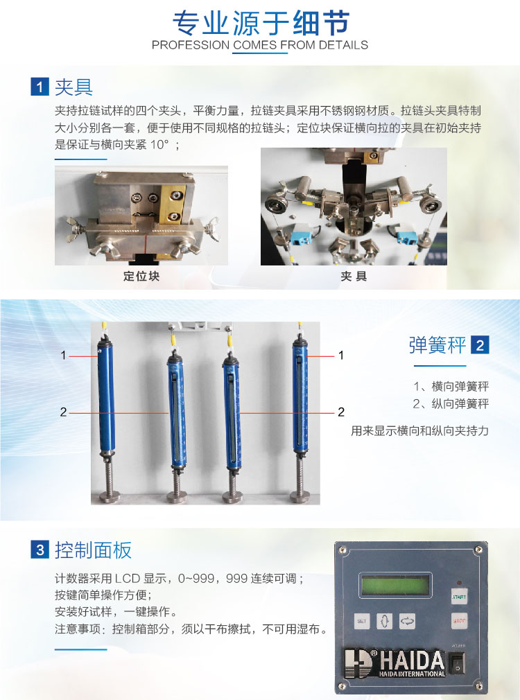 試驗(yàn)拉鏈于橫向及縱向張力之作用下,能否承受規(guī)定次數(shù)之往復(fù)拉動(dòng)操作,試驗(yàn)時(shí)本機(jī)以等速帶動(dòng)拉鏈之拉頭, 做每分鐘30次之往復(fù)運(yùn)動(dòng),至規(guī)定之次數(shù)為止 設(shè)計(jì)標(biāo)準(zhǔn):CNS-1083 |