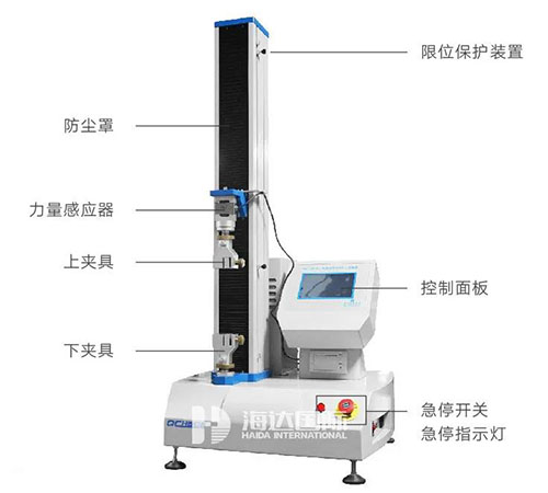 通常稱上限行程為上下夾具之間的距離(試驗行程)+上夾具高度+下夾具高度+傳感器高度。因不同試驗材料會選擇不同的夾具,所以選擇好了夾具才能知道具體試驗行程。材料的不同變形需要不同的試驗行程。如果材料變形600mm,應考慮750mm-800mm的試驗行程,由于測試不同的材料,應根據(jù)不同的測試標準,不同的測試標準需要不同的標距。