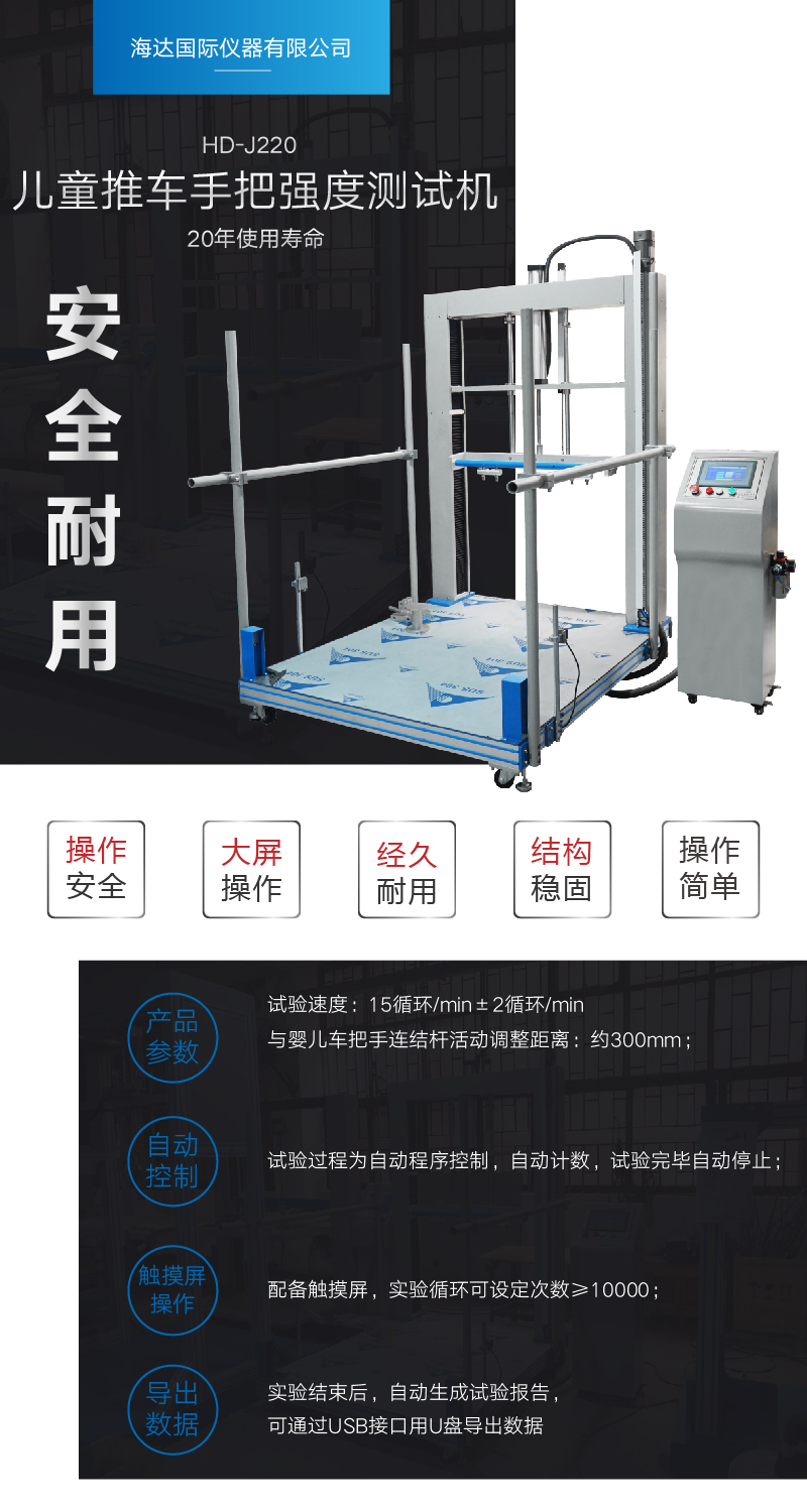 本機依據(jù)GB14748手推嬰兒車舉起下壓耐用試驗規(guī)范。測試方法為置模型嬰兒(或砝碼)于車臺中,舉起時使車臺后輪離地120mm,下壓時使車臺前輪離地120mm,以每分鐘15±1次,并持續(xù)往復(fù)測試3000次后,目視車臺有無損壞。達設(shè)定次數(shù),并能自動停止操作,故可24小時操作而無須人員看守。 |