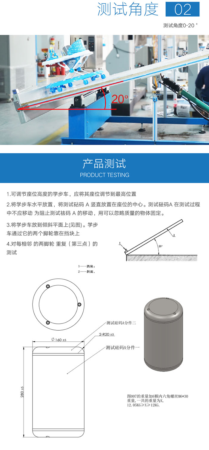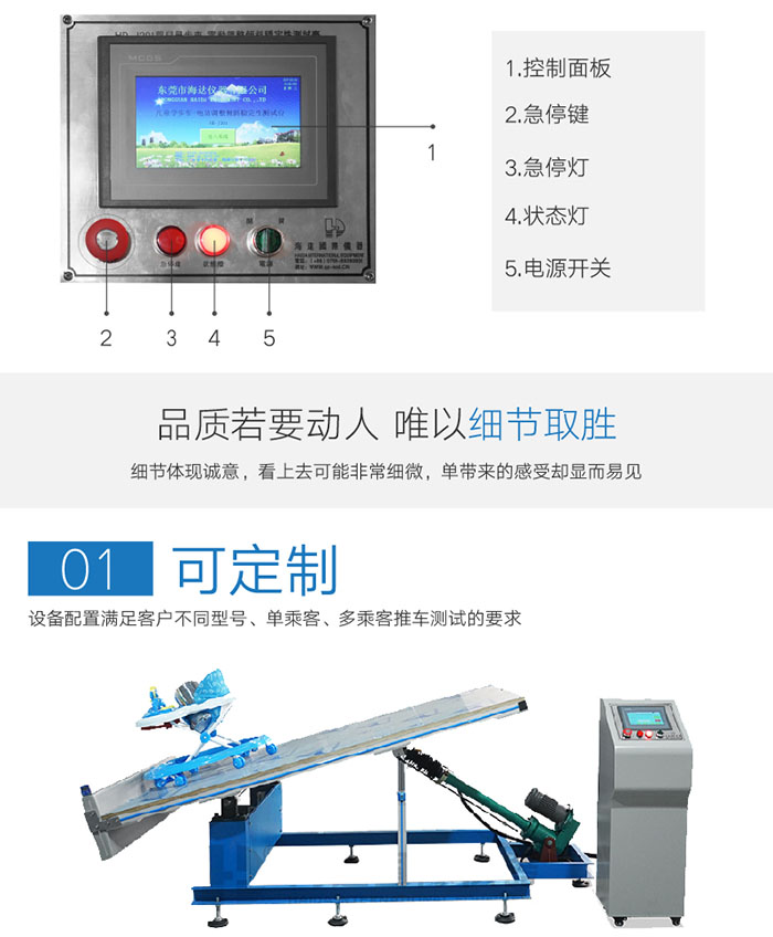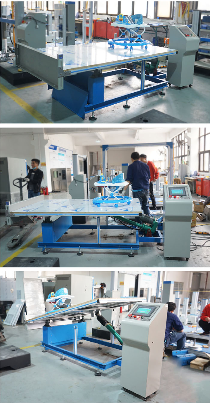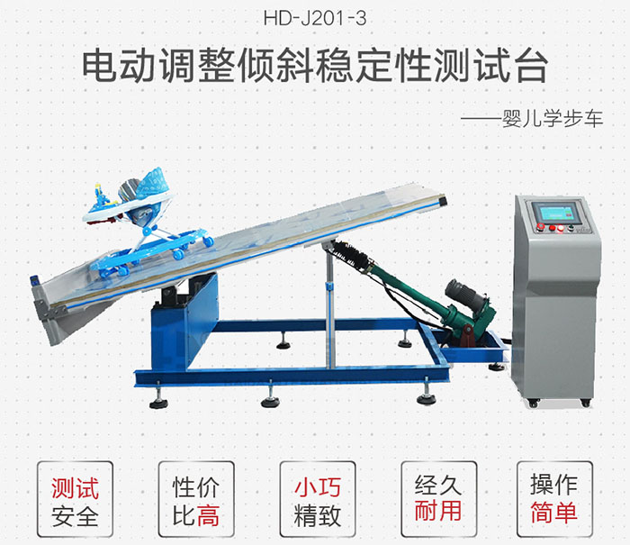 嬰兒車穩(wěn)定性測試性測試平臺通過穩(wěn)定性模擬測試,判斷嬰兒車臺穩(wěn)定性(車臺不得翻覆.測試時,任何提籃或座椅的附屬部件都不得與車架分離. | ||